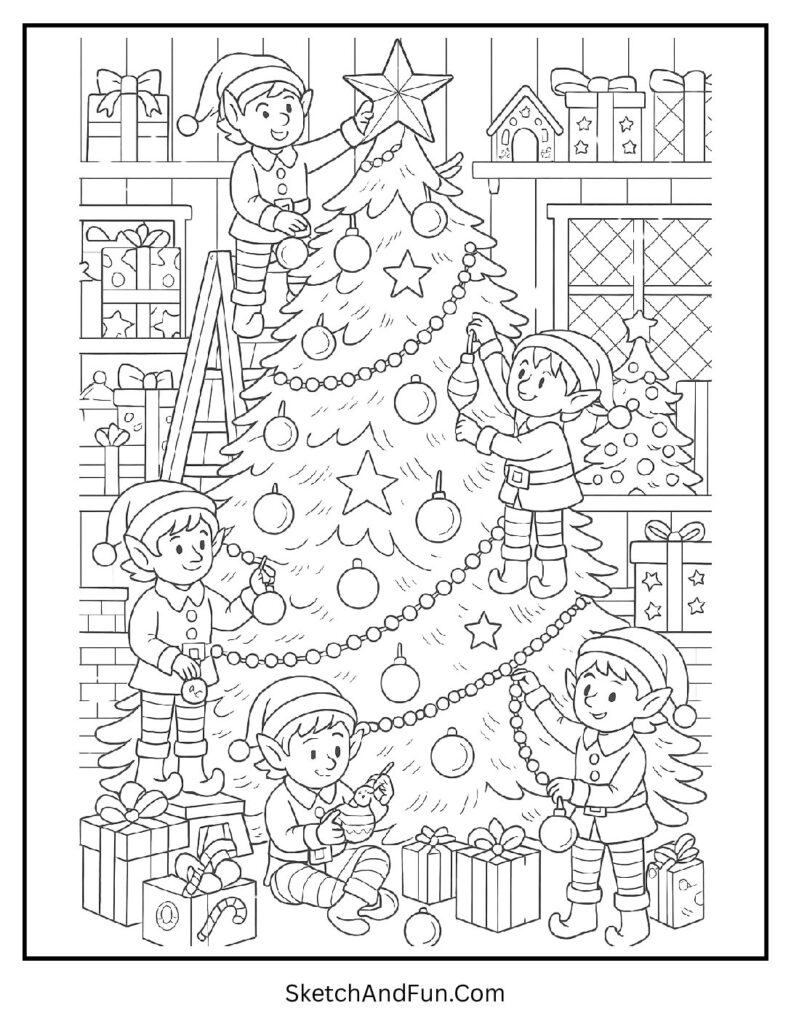 Elves decorating tree in workshop for christmas tree coloring page for printing.