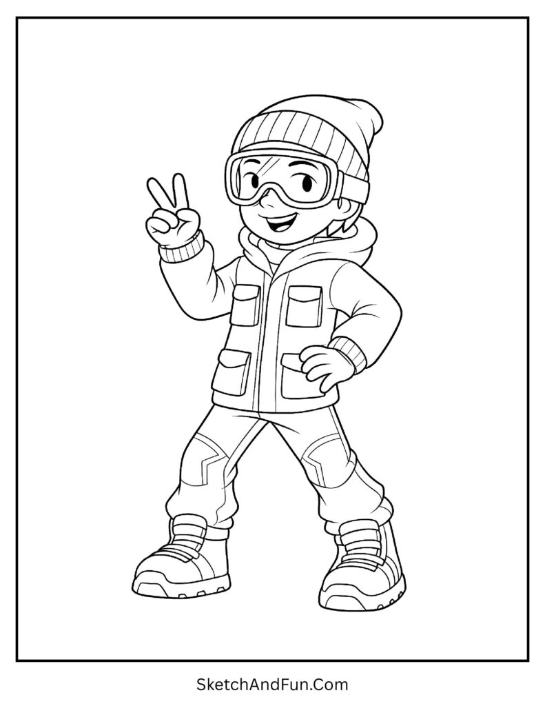 A teen strikes a cool pose in goggles and snow gear—straight from the winter outfit coloring pages adult version collection.