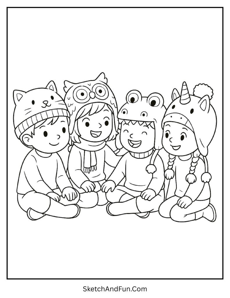 A group of children laugh and show their funny hats—penguins, bears, reindeer—you’ll find this joy captured perfectly in our winter outfit coloring page free printable.