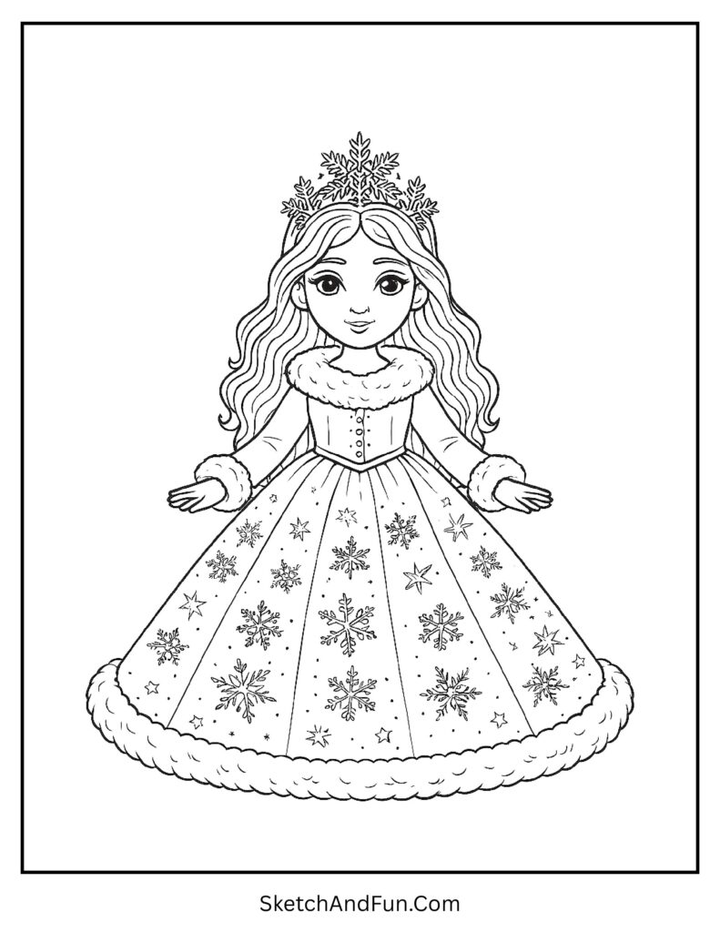 A magical gown with fur trim and a crown shines bright, making it a lovely choice from winter outfit coloring pages for girls who enjoy festive fun too.